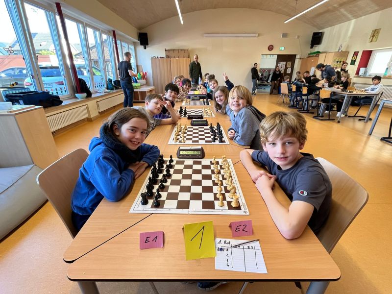 Auch in diesem Jahr durften wir die Kreismeisterschaft im Schulschach wieder in der Aula unserer Schule ausrichten. Mit vier eigenen Mannschaften traten wir dabei am Dienstag, den 03.03.2026 gegen zwei Mannschaften aus Neukirchen-Vluyn und zwei Mannschaften aus Hamminkeln an. Jede Mannschaft bestand aus vier Kindern plus ein bis zwei Ersatzspielern. Im Rundenturnier spielte jede Mannschaft gegen jede andere Mannschaft insgesamt sieben Runden Schach mit einer Bedenkzeit von 10 Minuten plus 5 Sekunden pro Zug.