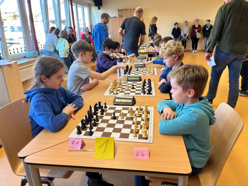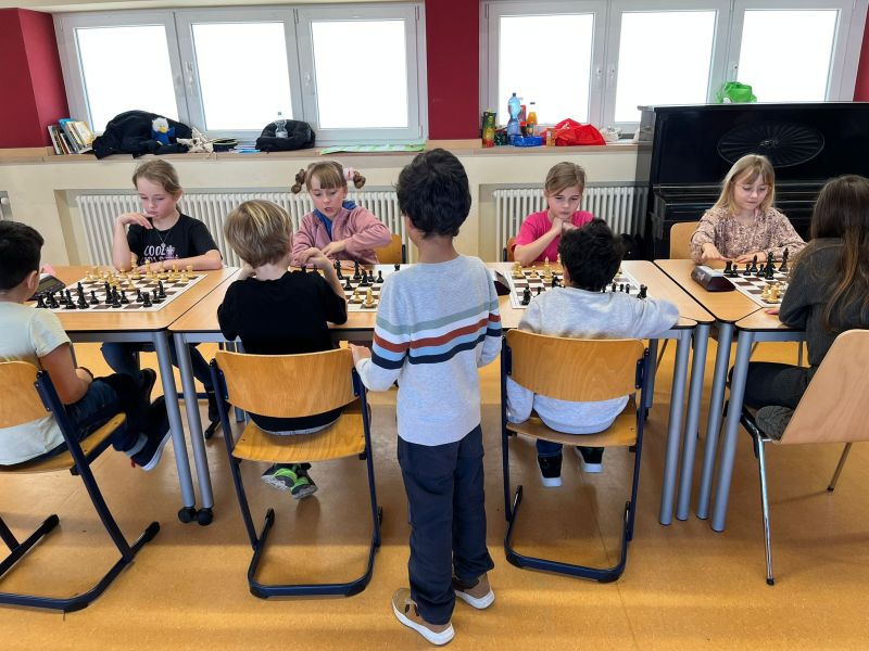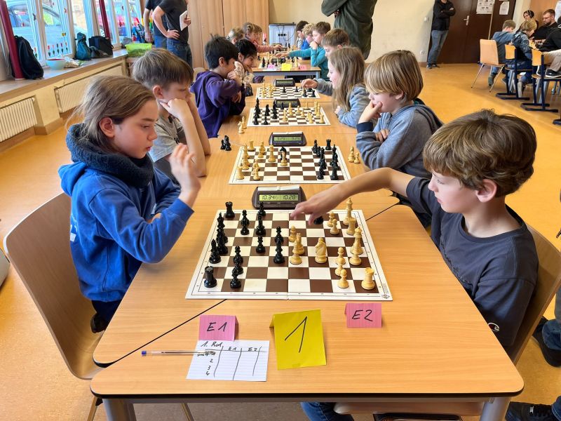 Auch in diesem Jahr durften wir die Kreismeisterschaft im Schulschach wieder in der Aula unserer Schule ausrichten. Mit vier eigenen Mannschaften traten wir dabei am Dienstag, den 03.03.2026 gegen zwei Mannschaften aus Neukirchen-Vluyn und zwei Mannschaften aus Hamminkeln an. Jede Mannschaft bestand aus vier Kindern plus ein bis zwei Ersatzspielern. Im Rundenturnier spielte jede Mannschaft gegen jede andere Mannschaft insgesamt sieben Runden Schach mit einer Bedenkzeit von 10 Minuten plus 5 Sekunden pro Zug.